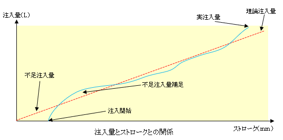 自動及び連動運転中に於ける流量の加減はグラフの様に理論注入量を目指します。シールドマシン掘削開始から注入開始までのタイムラグが必ず生じ、それからくる不足注入量を補足しようとして流量を上昇させます。理論注入量に追いつき次第、補足をとりやめジャッキスピードに連動した流量を吐出します。再度不足分が発生した瞬間から流量を上昇させ最終的には理論注入率に近づくように制御します。