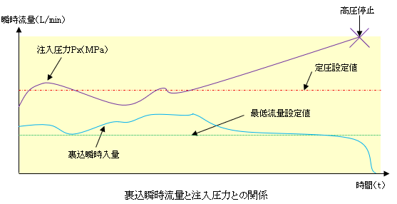 定圧制御に於ける圧力に対し流量の減少経過は図のグラフになります。注入圧力が定圧設定値を上回ると流量を減少させていきます。しばらくして注入圧力が低下すると裏込瞬時流量を復旧していきます。再度注入圧力が上昇し始めると裏込流量を減少させていきます。この時最低流量よりも流量が下回る事はありません。従って注入圧力が最低流量まで減少しても注入圧力が低下しない場合、注入圧力は上昇を続け高圧停止となります。