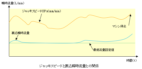 注入率制御に於けるジャッキスピードに対し瞬時流量の増減経過は図のグラフになります。ジャッキスピードが上昇してくると瞬時流量を増加させます。ジャッキスピードが下降してくると流量を減少させます。但し最低流量よりも減少する事はありません。再度ジャッキスピードが上昇すると瞬時流量も増加します。